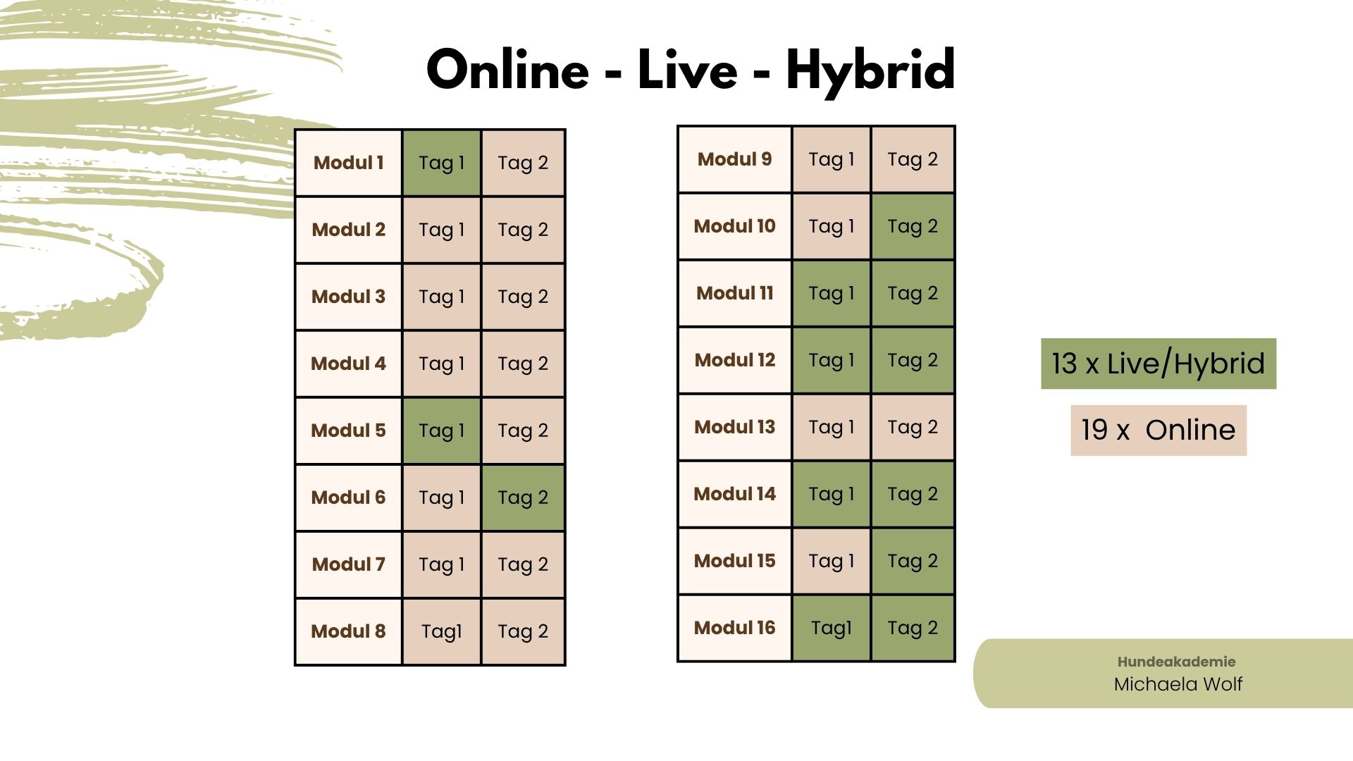 Im Unterrichtsplan erhältst du eine Übersicht über die Lerninhalte und welche Module online oder live/hybrid stattfinden.